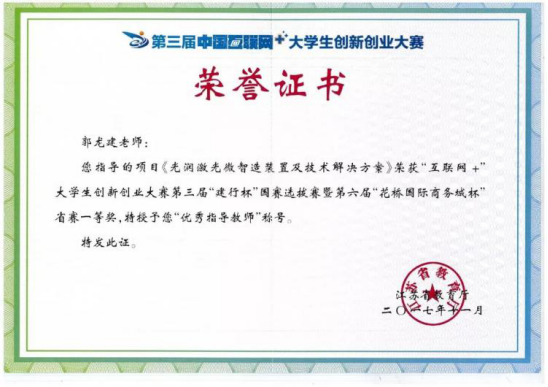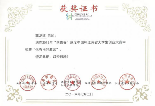 组织并没有忘记郭龙建的付出,从2008年至2018年郭龙建分别被共青团江苏省委、江苏省教育厅等授予“江苏省大学生创业计划竞赛优秀指导教师”荣誉称号;2016年和2017年被江苏省教育厅评为江苏省“互联网+”大学生创业大赛优秀指导教师;2019年被学校聘为首个教学型资格教授。