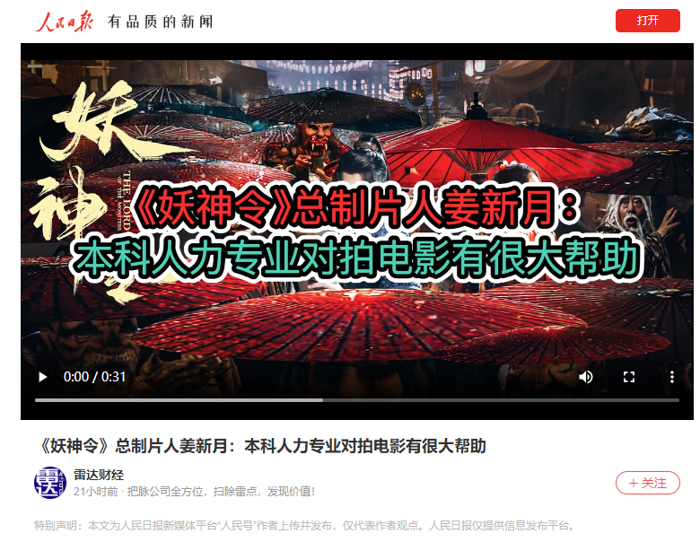 视频链接:《妖神令》总制片人姜新月:本科人力专业对拍电影有很大帮助https://www.163.com/v/video/VGU9CRNV7.html