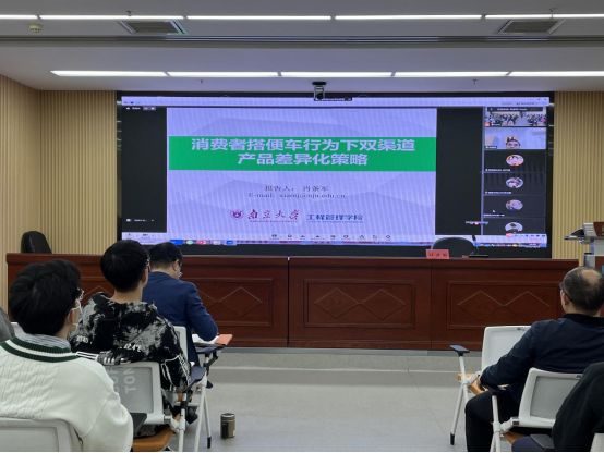 肖条军教授从研究背景切入,介绍了双渠道供应链中的消费者搭便车行为与双渠道制造商的产品策略,从而提出双渠道产品差异化能否抑制消费者搭便车行为、制造商的最优产品策略以及制造商与实体零售商能否达到双赢等三个研究问题。同时,肖条军教授构建模型,详细介绍了参数设置和函数推导过程。在讲座的提问环节,肖教授细致回答了我院老师和学生的有关变量设置问题,对我院教师和研究生更好地开展学术研究具有较高的指导价值。